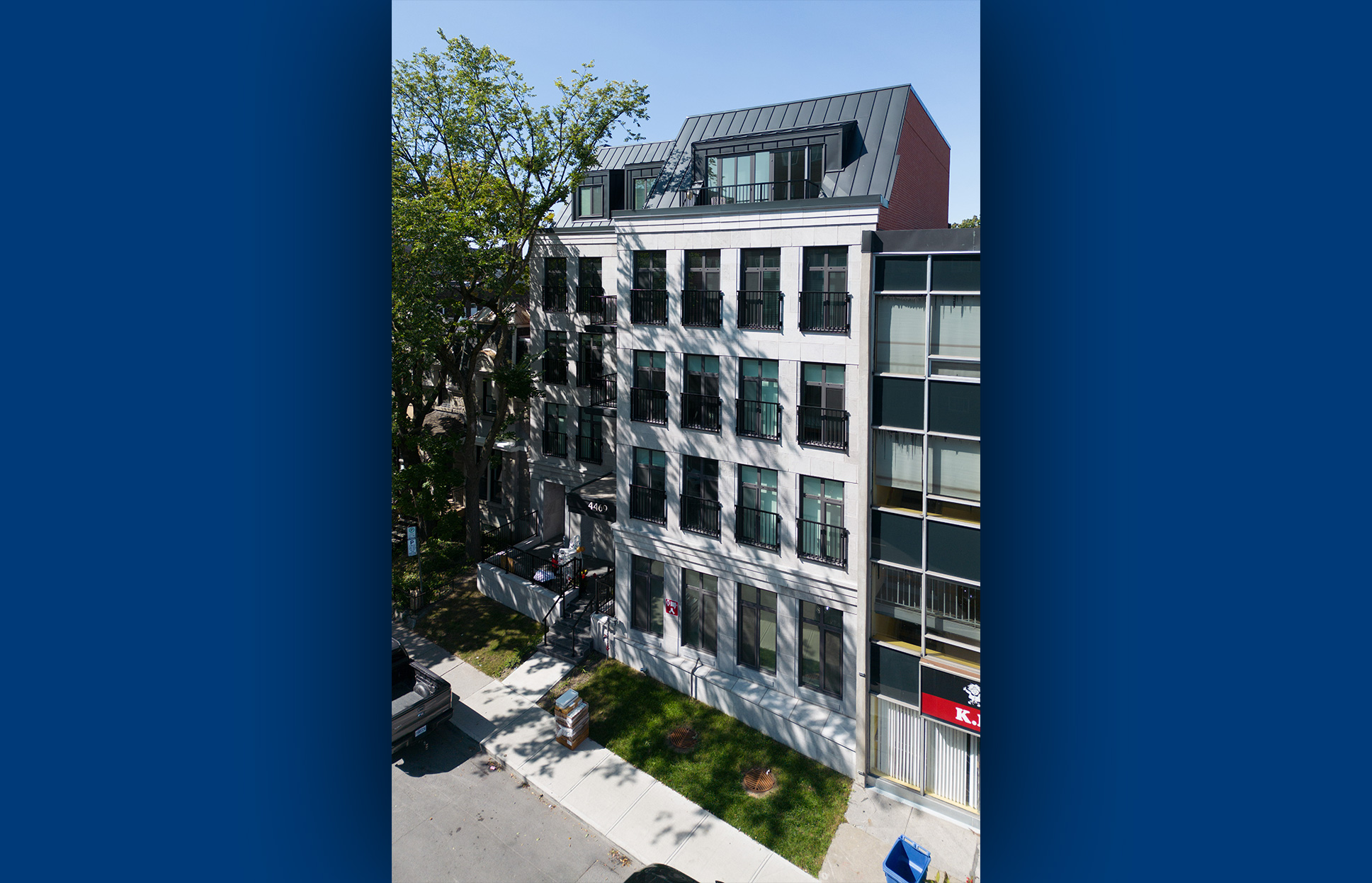 4469 Ste-Catherine St. West is the development of a 5-storey rental building, complete with an underground parking garage. The frontage of the building is made of Quebec St. Marc stone and features artisan zinc sloping roof panels. The building replaces a vacant lot between two existing buildings at the corner of Ste-Catherine Street, and Metcalfe Street in the Westmount municipality.