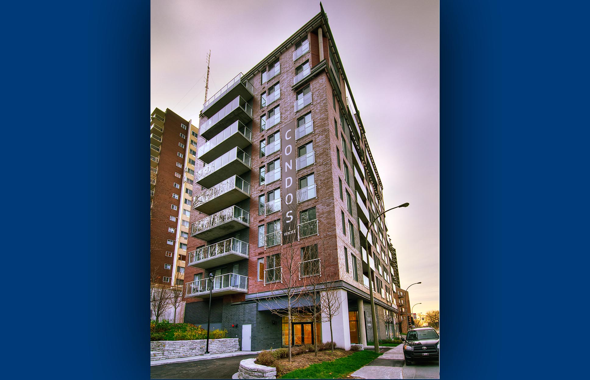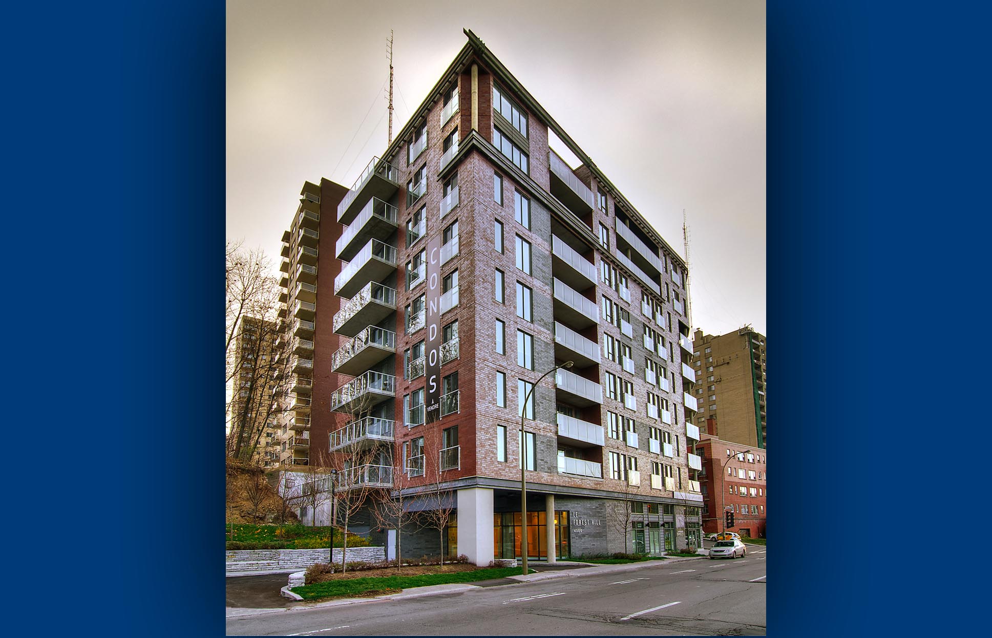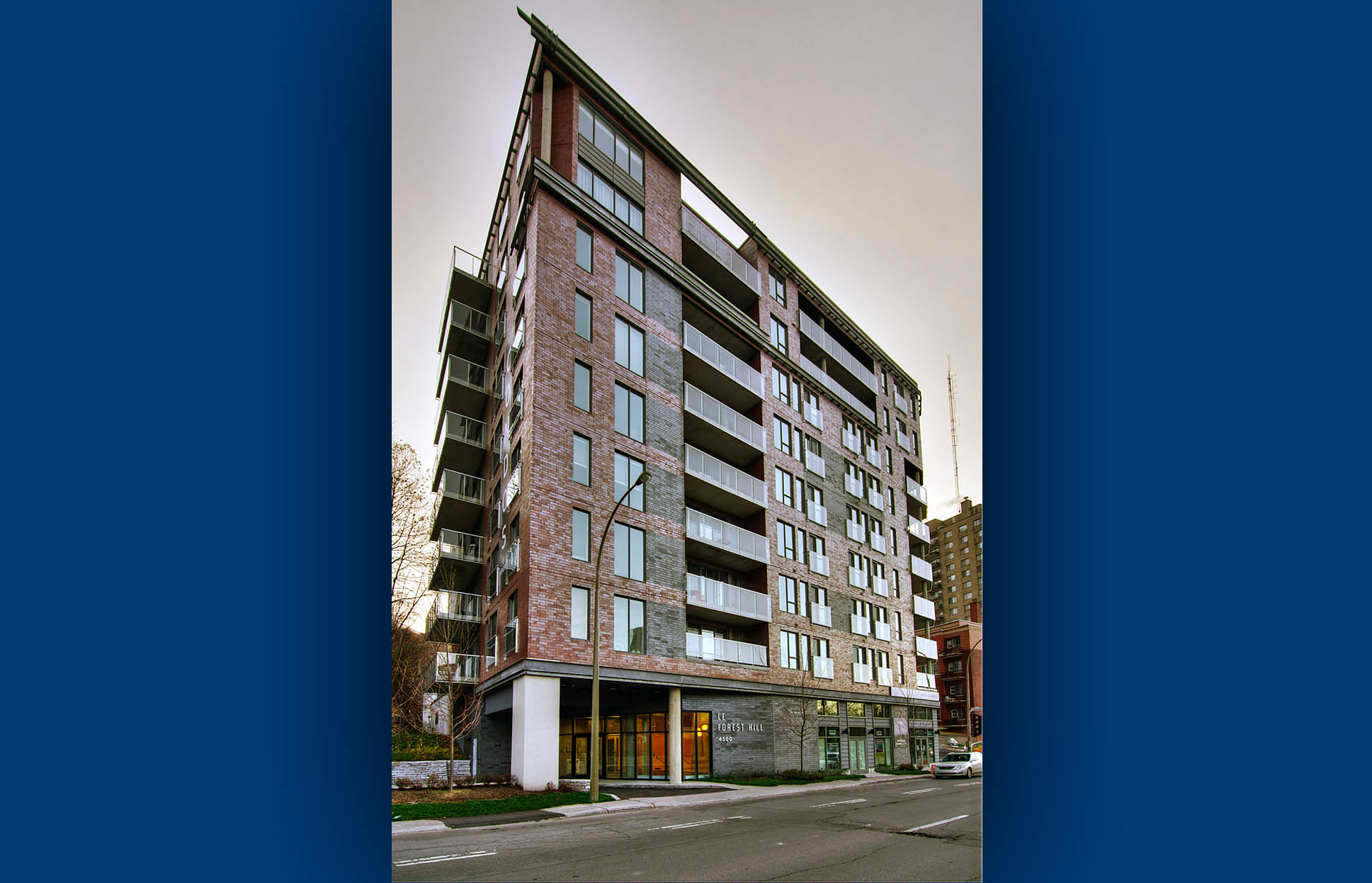 This nine storey, 75 unit condominium is located at the base of Mount Royal. Each unit includes a european style kitchen and hardwood floors. The building is equipped with underground parking and lavish landscaping.
