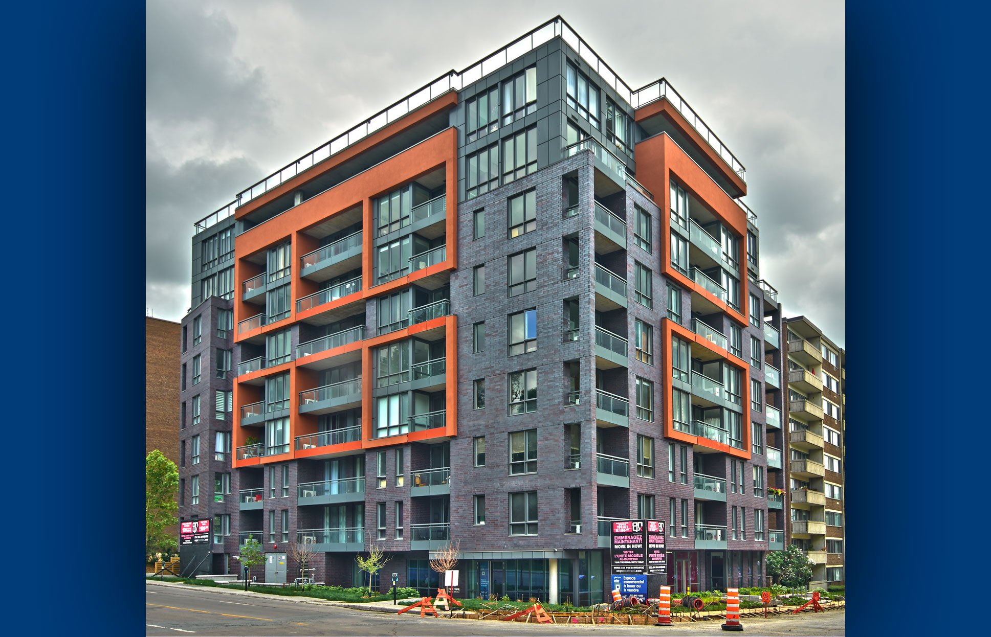 ONYX is a modern designed building including multi-colored exterior cladding in brick, steel panels and glass. In addition, this project contains several 2 storey penthouses, European style appliances, quartz countertops and avant-garde plumbing fixtures.