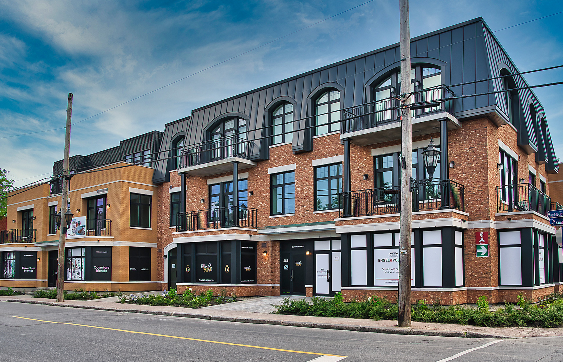 This project is a luxury condominium building built on the former Pioneer site, in the heart of Pointe-Claire village. It is a 3 storey new construction of 52,150 square feet including one storey of underground parking. There will be 14 unique condo units and 4 commercial spaces on the ground floor. The building occupies the entire site.